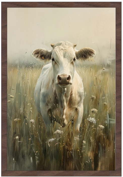 12x18" White Wildflower Cow (UV Printed/Walnut Framed)
