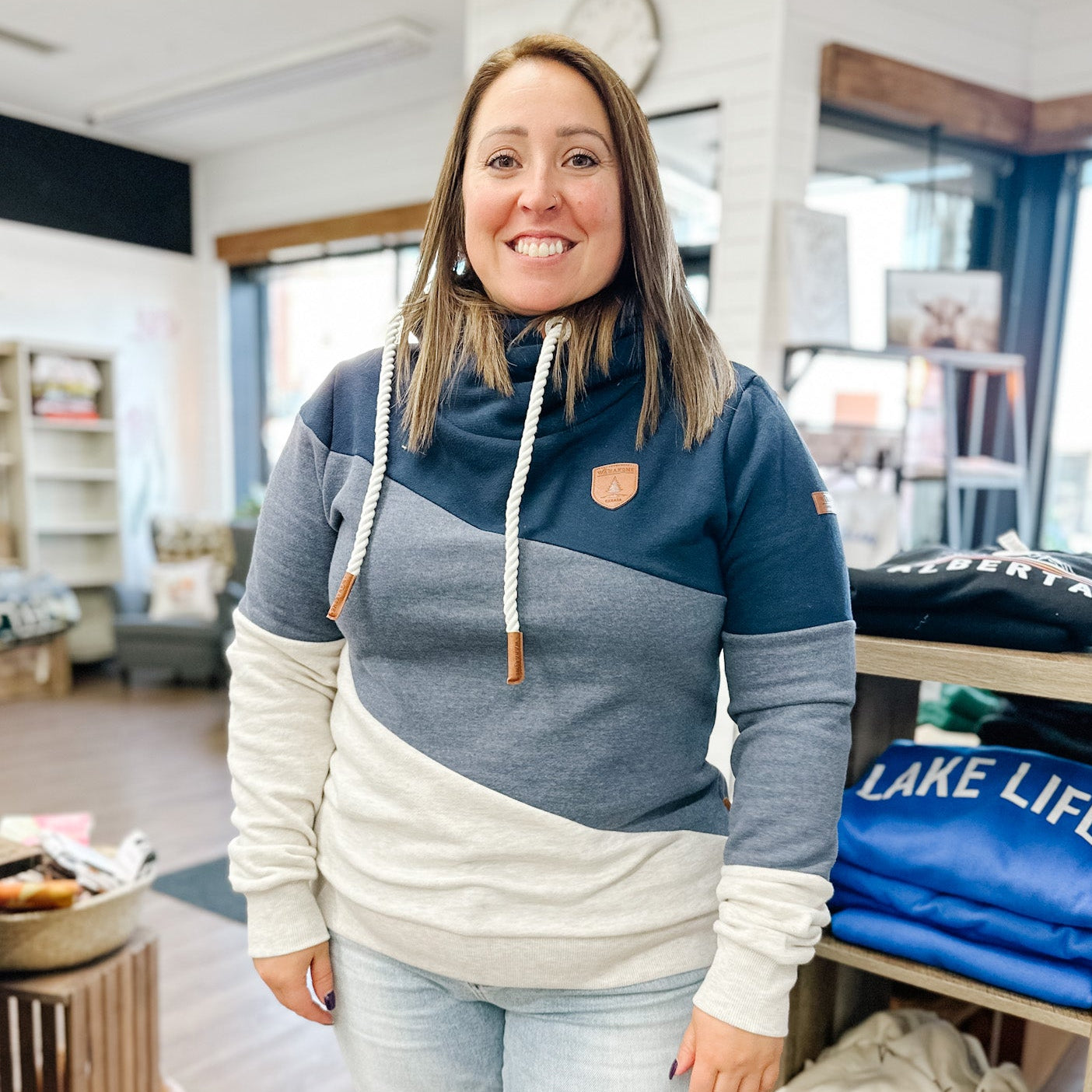 • Adjustable hood with thick, rope-style drawstrings and vegan leather caps