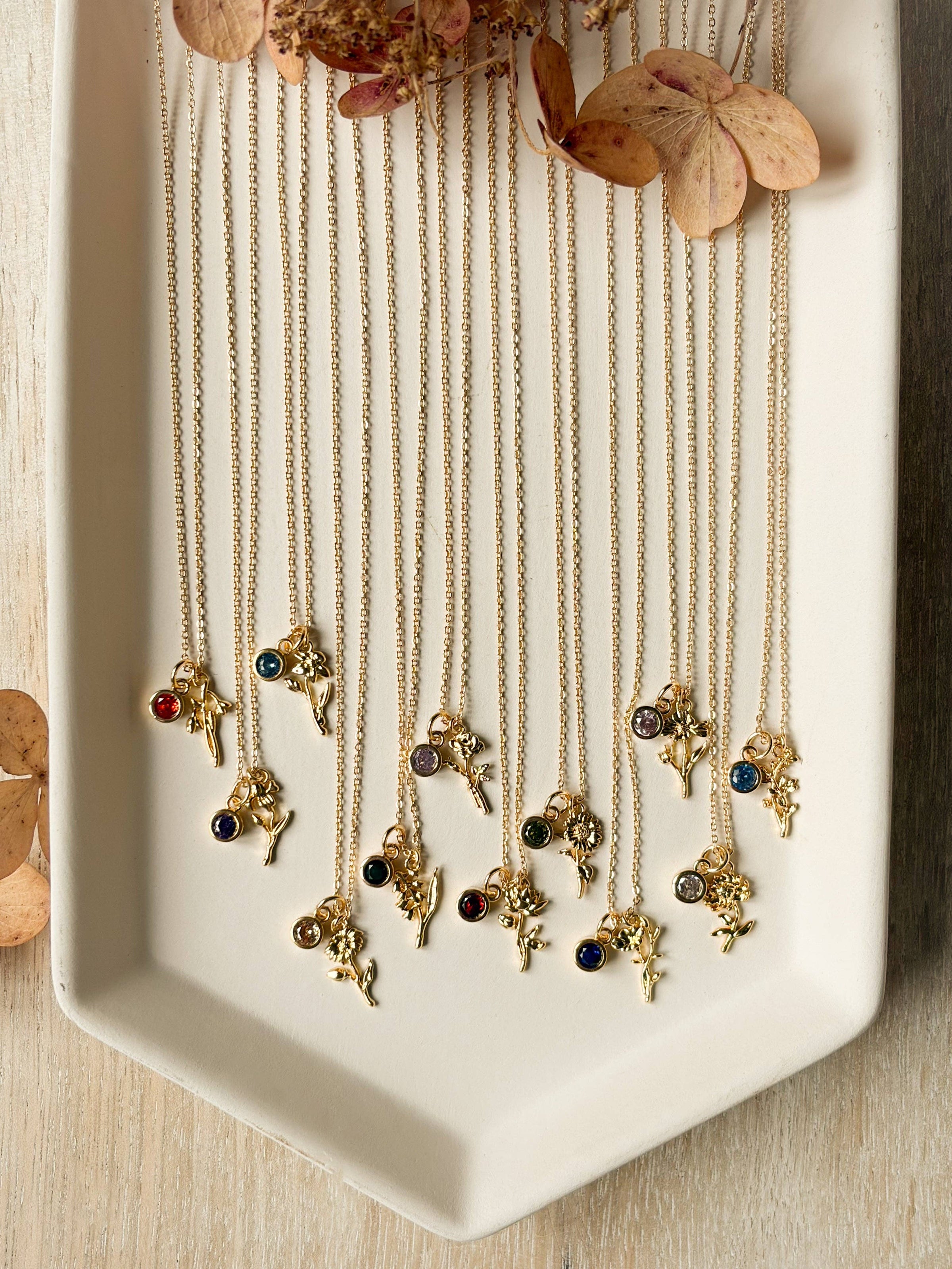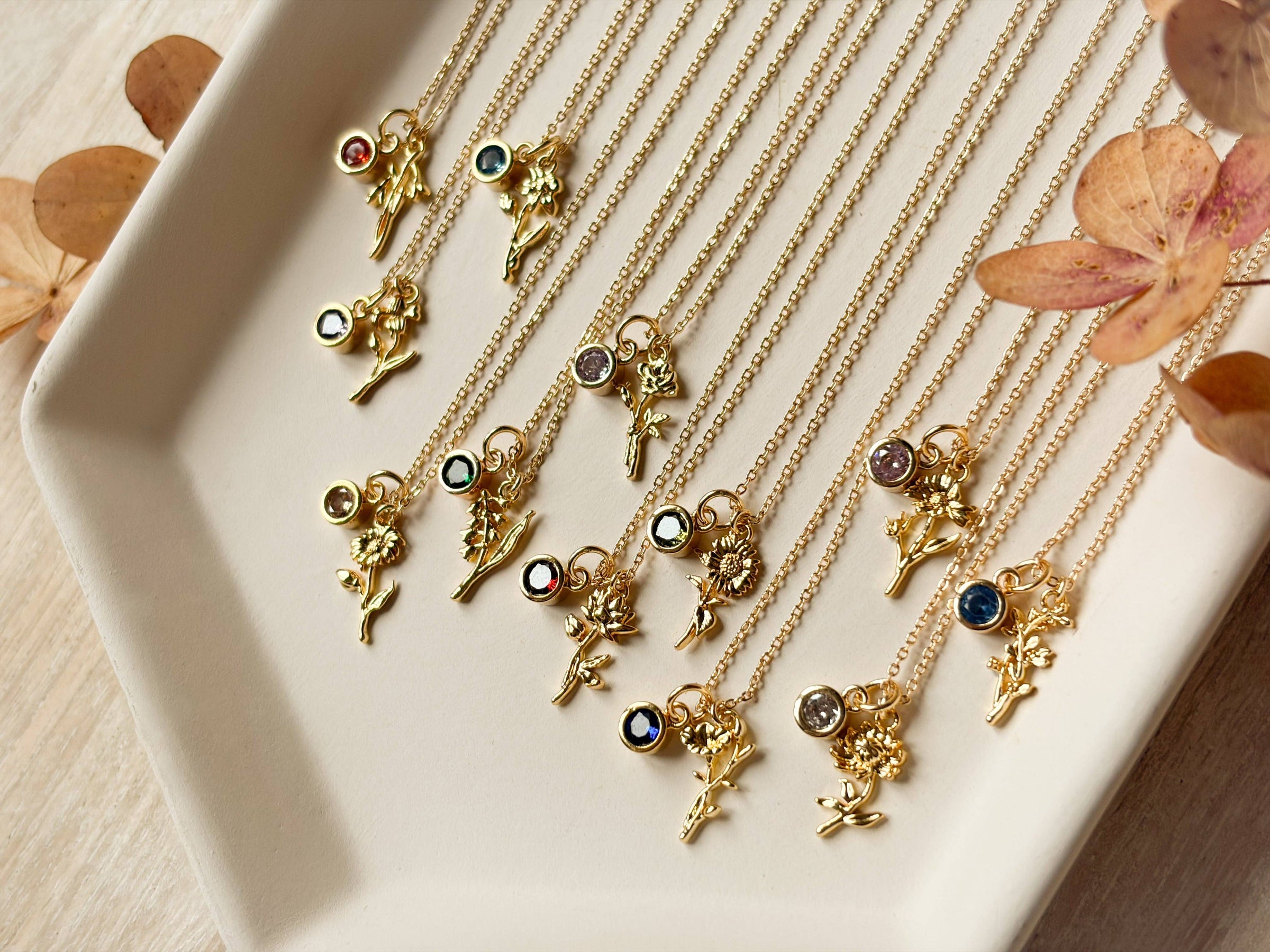 A meaningful 18-inch necklace featuring your birth flower and birthstone — a beautiful symbol of your month and personality. Crafted with care, this piece is nickel free and 14K gold plated for lasting shine and comfort. A timeless keepsake or thoughtful gift for someone special.