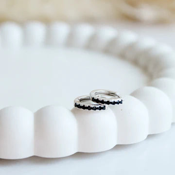 These hoops are designed to stack perfectly with our other black-accented pieces, offering a stylish and coordinated look. Crafted from high-quality sterling silver and featuring striking black stones, these earrings are the perfect accessory for adding a touch of elegance and edge to any outfit.