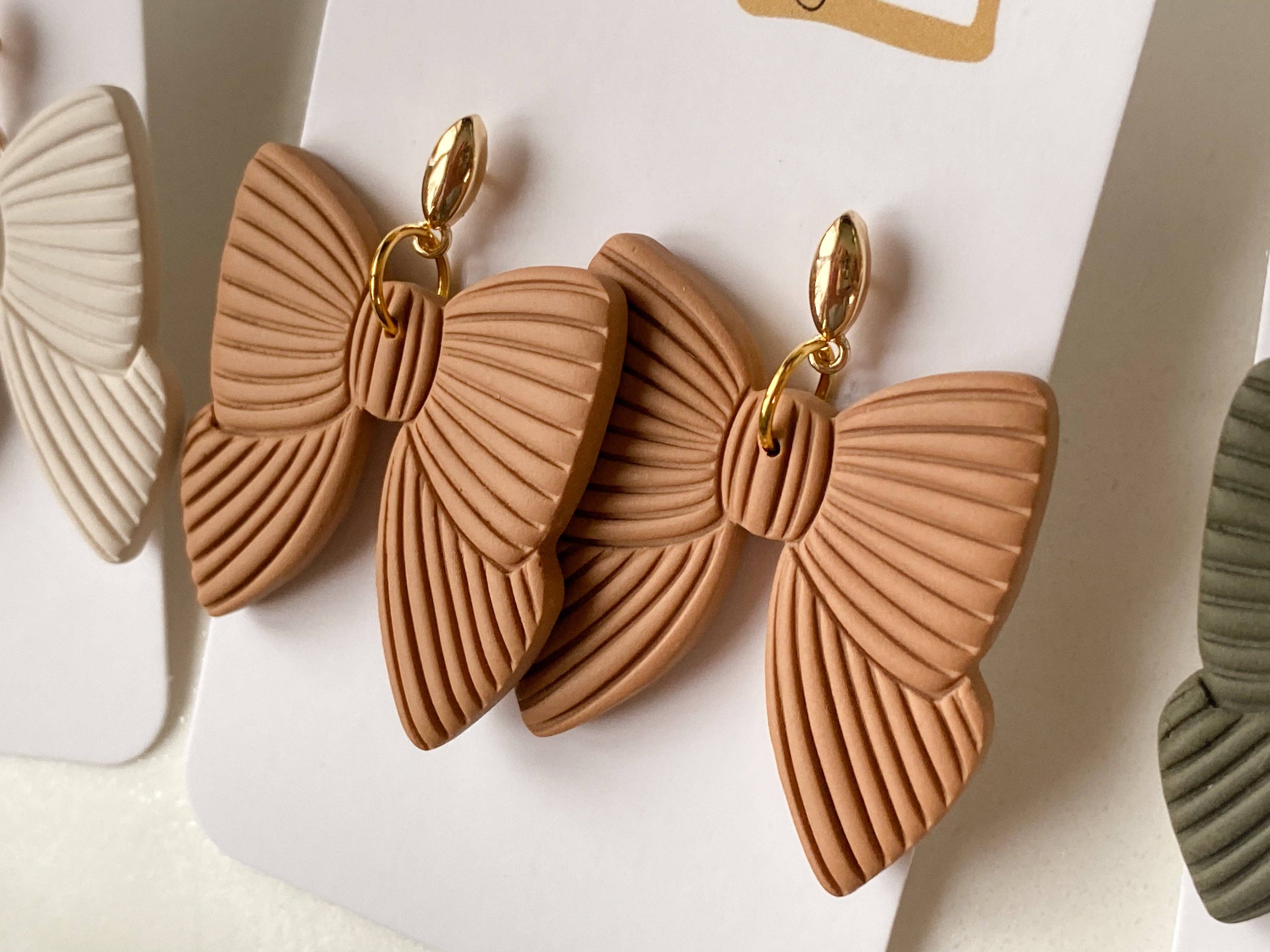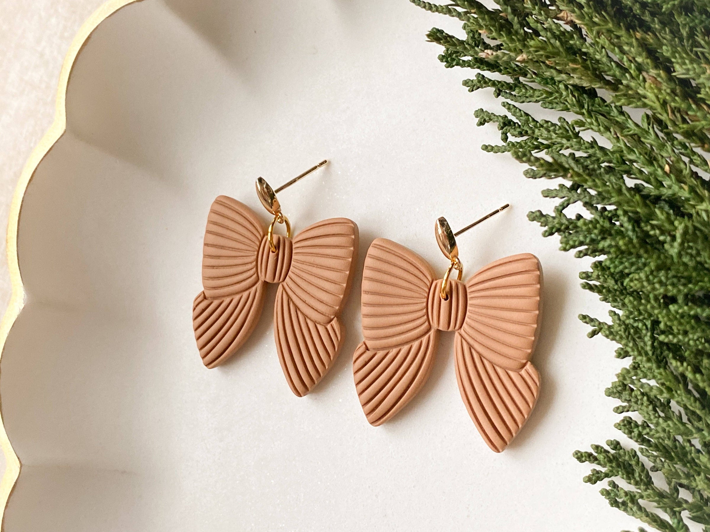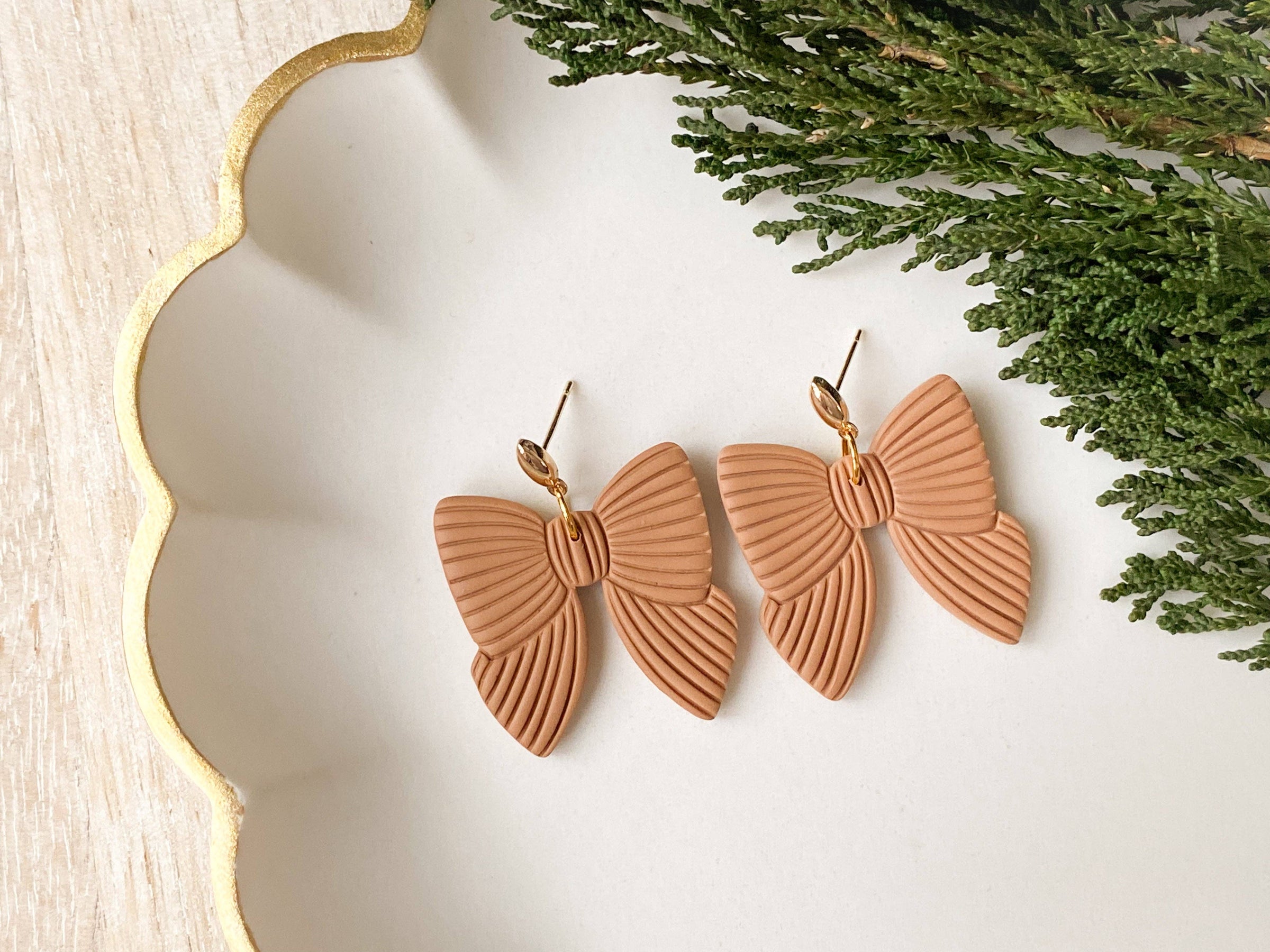 Handmade from polymer clay and available in three colors, these bow dangles are the finishing touch to the perfect outfit. Lightweight and nickel free. Available in Balsam, Carmel, and Ivory