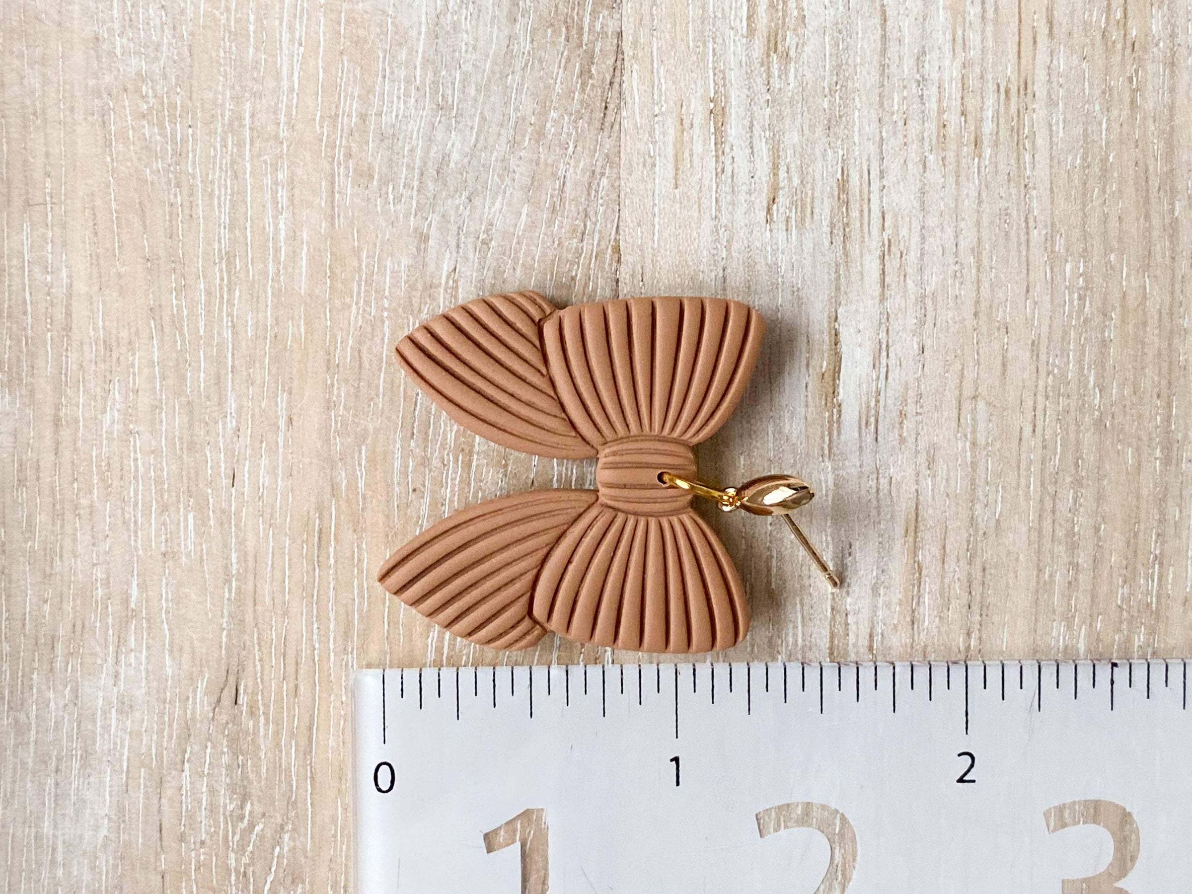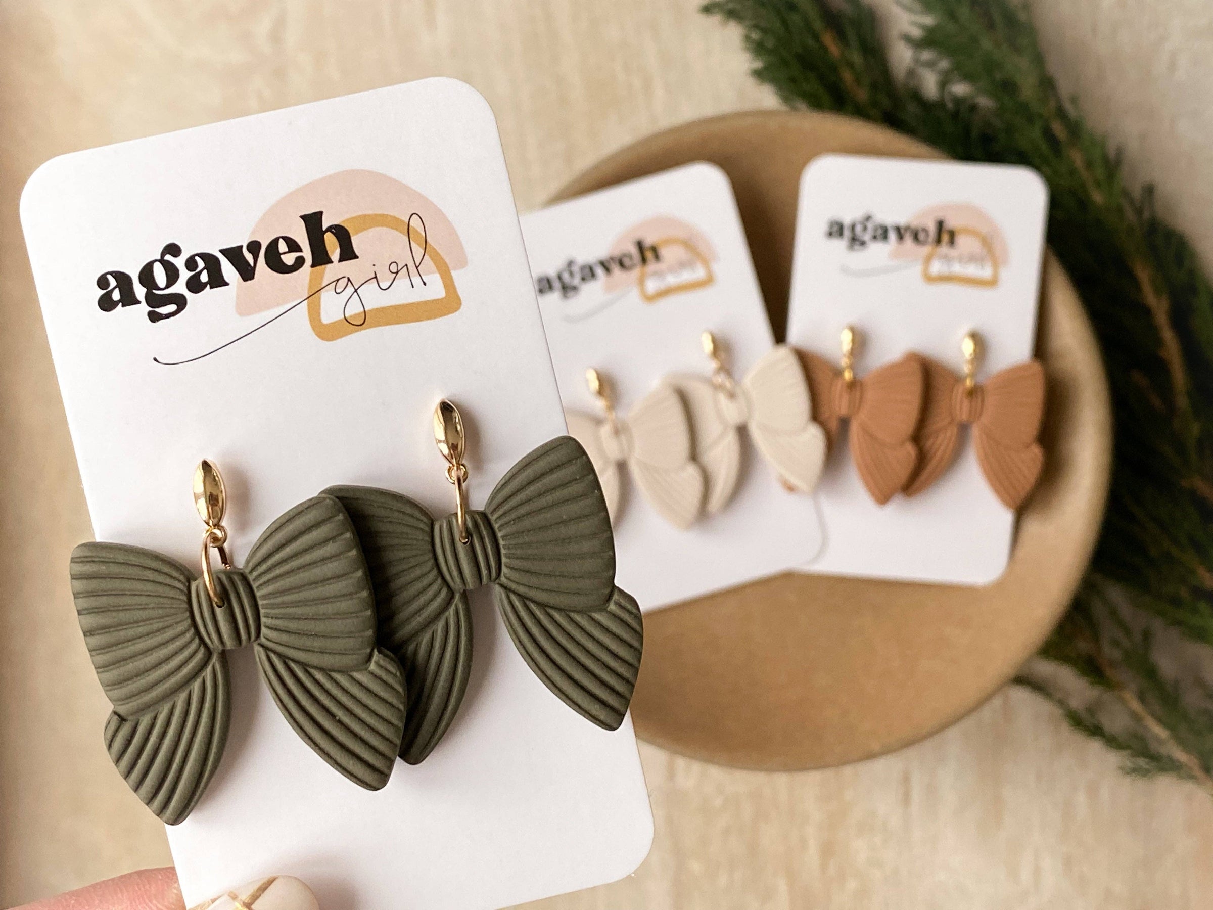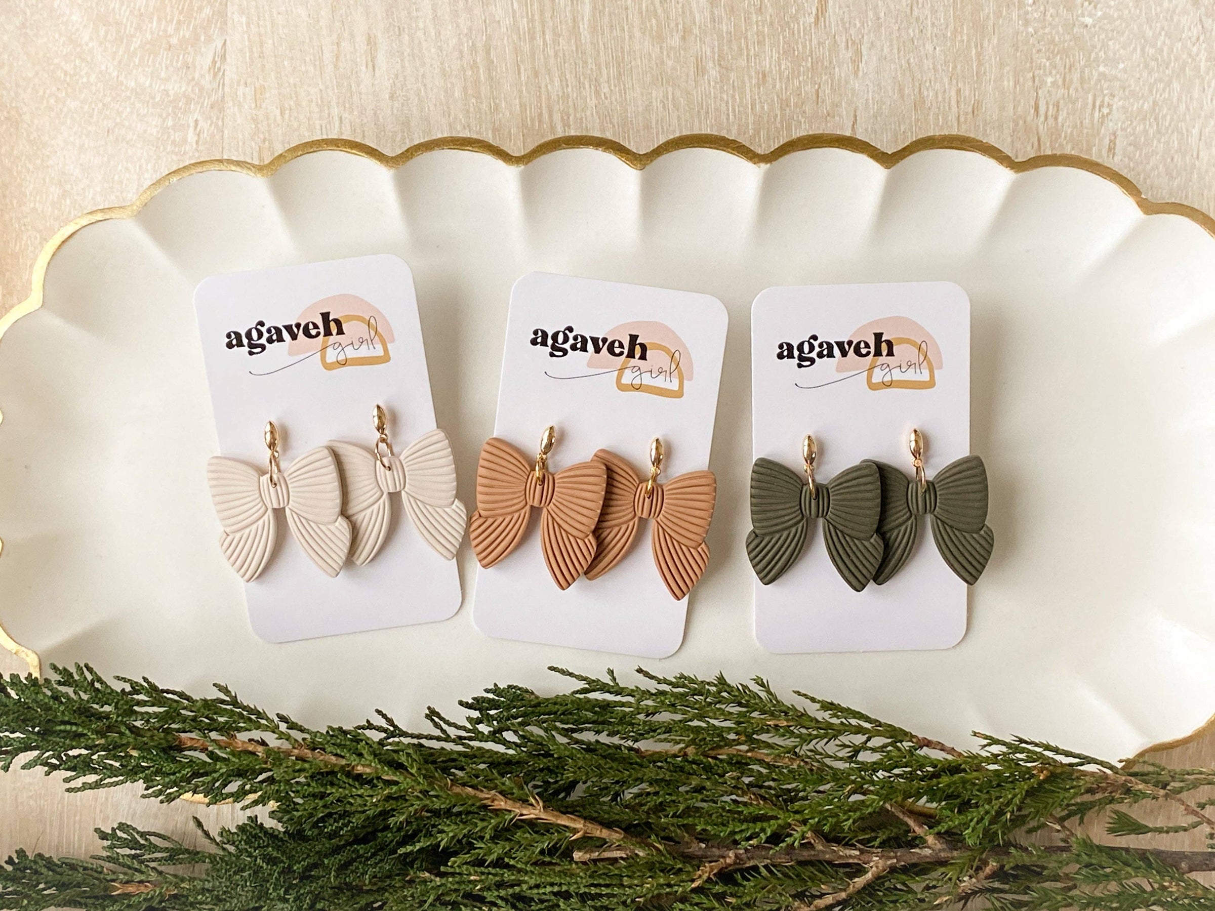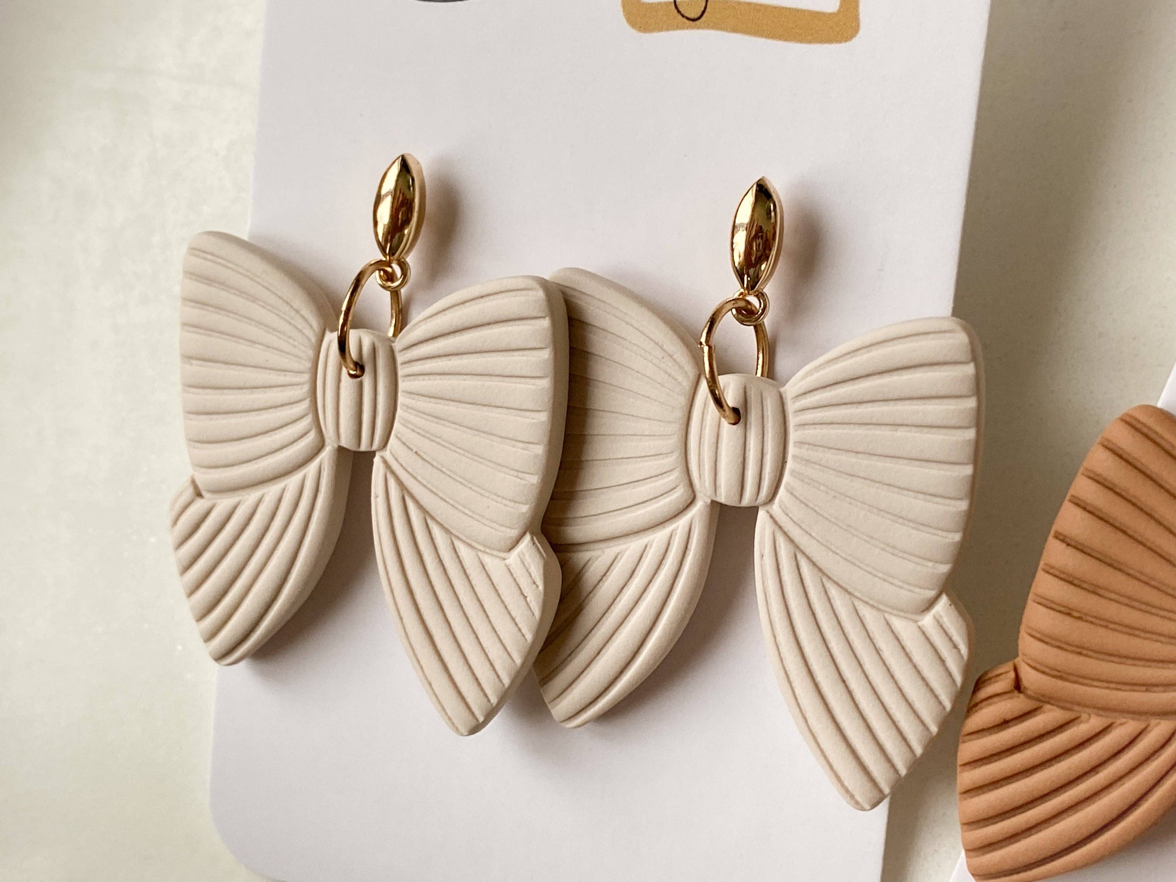 Handmade from polymer clay and available in three colors, these bow dangles are the finishing touch to the perfect outfit. Lightweight and nickel free. Available in Balsam, Carmel, and Ivory