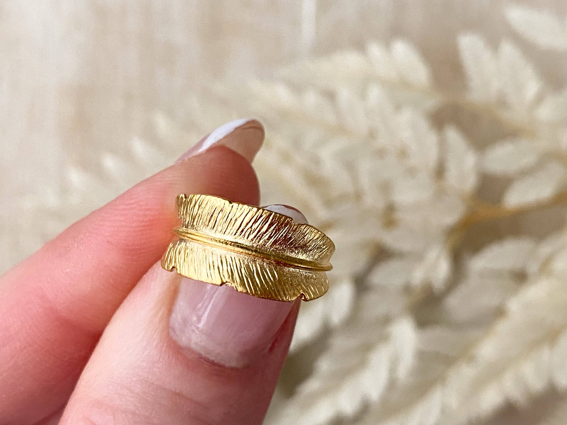 A delicate feather wraps gracefully around your finger in this adjustable ring. Crafted in matte gold, it carries a soft, organic texture with timeless boho charm. Lightweight, versatile, and designed for everyday wear.