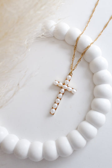 Elegant and timeless, the Pearl Cross Necklace features a gold setting adorned with dainty pearls for a soft, refined finish. A beautiful piece that adds meaning and sophistication to any look — perfect for layering or wearing solo.