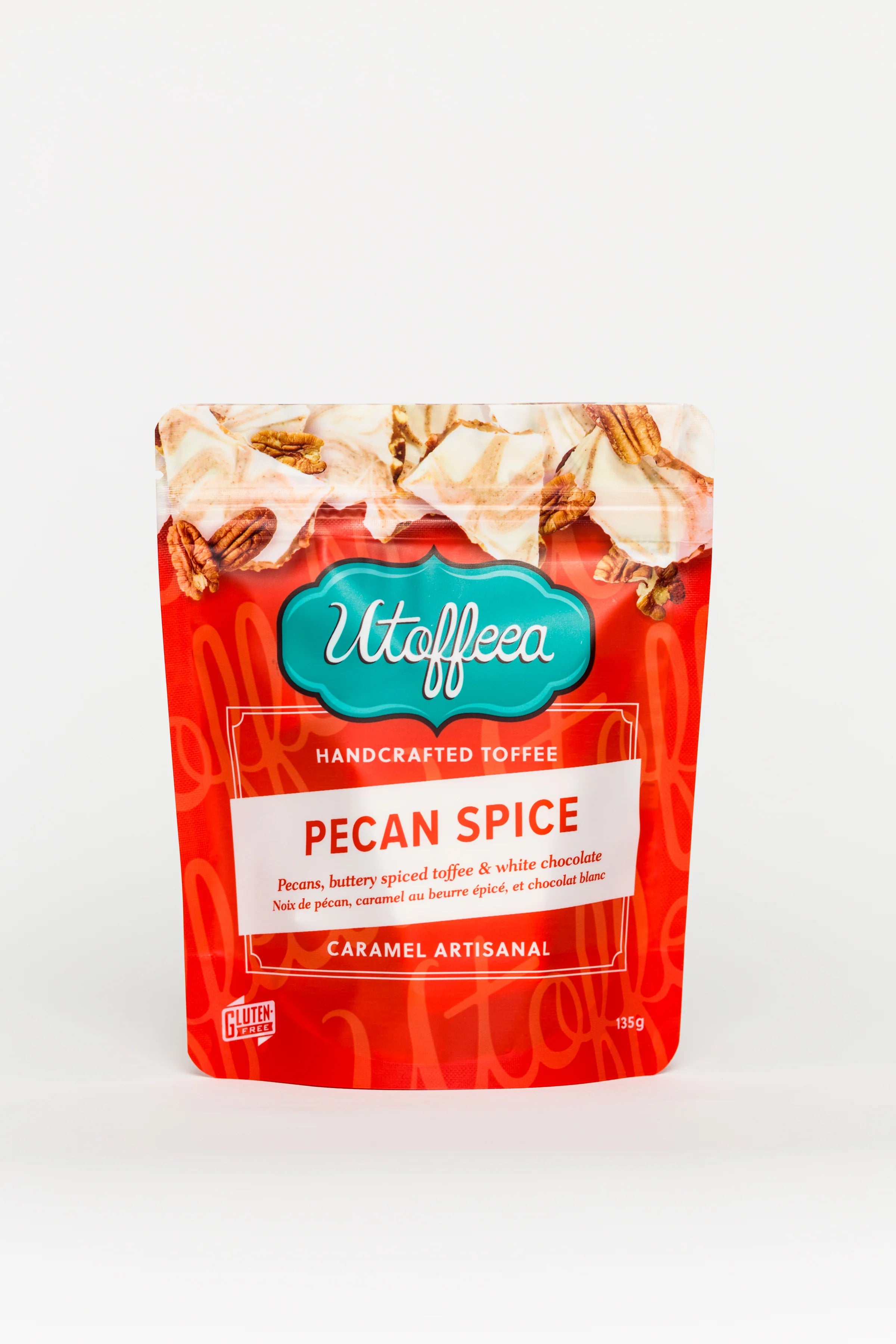 We think you're going to love Utoffeea Pecan Spice! Layers of roasted pecans, buttery spiced toffee, and swirled white chocolate with cinnamon. It's snappy, delicious, and created to bring you JOY!