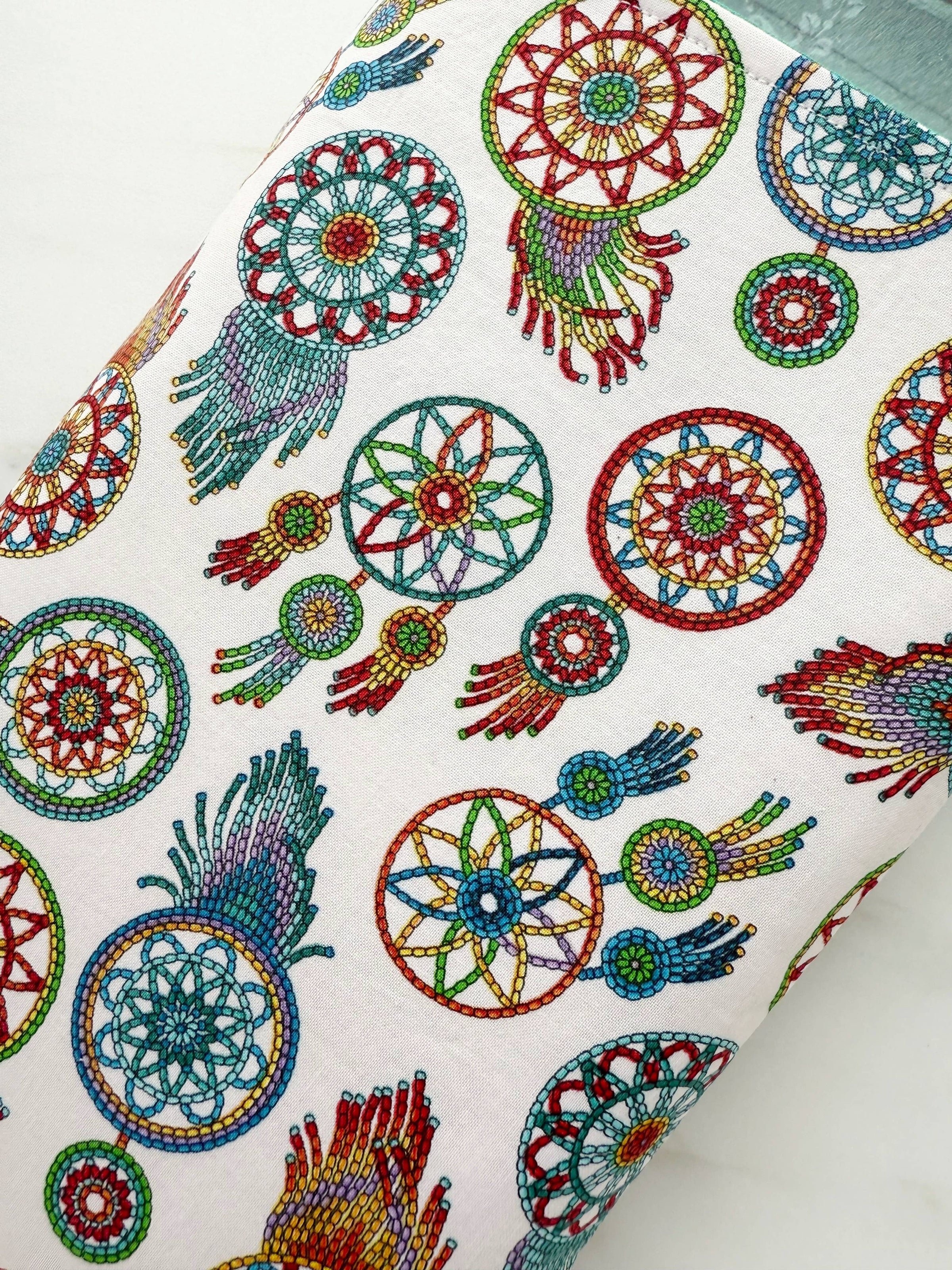 Protect your beloved books from wear and tear with a beautiful book sleeve. Made from cotton fabric, the sleeve is slim and fits easily into a purse or backpack while being sturdy and protective. This book sleeve features beautiful beaded dream catchers on an off white background. It is lined in a matching green cotton lining. Book sleeves come in two sizes: *small (6.25x9") fits mass market paperbacks and some smaller trade paperbacks *large (8x11.5") fits trade paperbacks and some hardcovers The sleeves can also be used for some e-readers and tablets. Book sleeves are packaged in resealable cellophane bags with a label stating materials, care instructions and business name. Please specify if other packaging is preferred. book protector, book related gifts, book merchandise, book lover gifts, book pouch, back to school