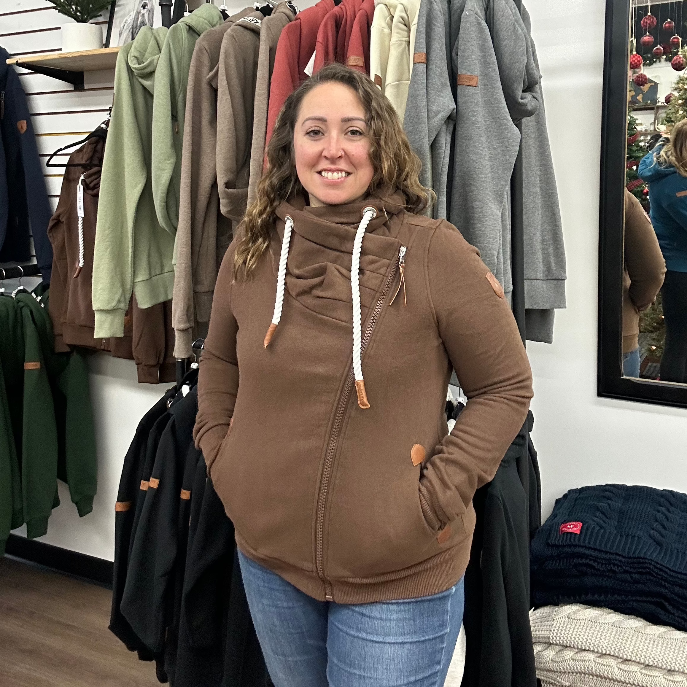 Introducing the Wanakome Hestia Hoodie in Mineral Blue! This women's hoodie features a stylish cowl neck with adjustable drawstrings and vegan leather caps, as well as a diagonal side zipper and front pockets with vegan leather details. Made from a soft and cozy brushed French terry fabric, perfect for any season. Don't forget about the vegan leather Wanakome patch logo embroidered on the sleeve. Upgrade your wardrobe with this versatile and comfortable hoodie.