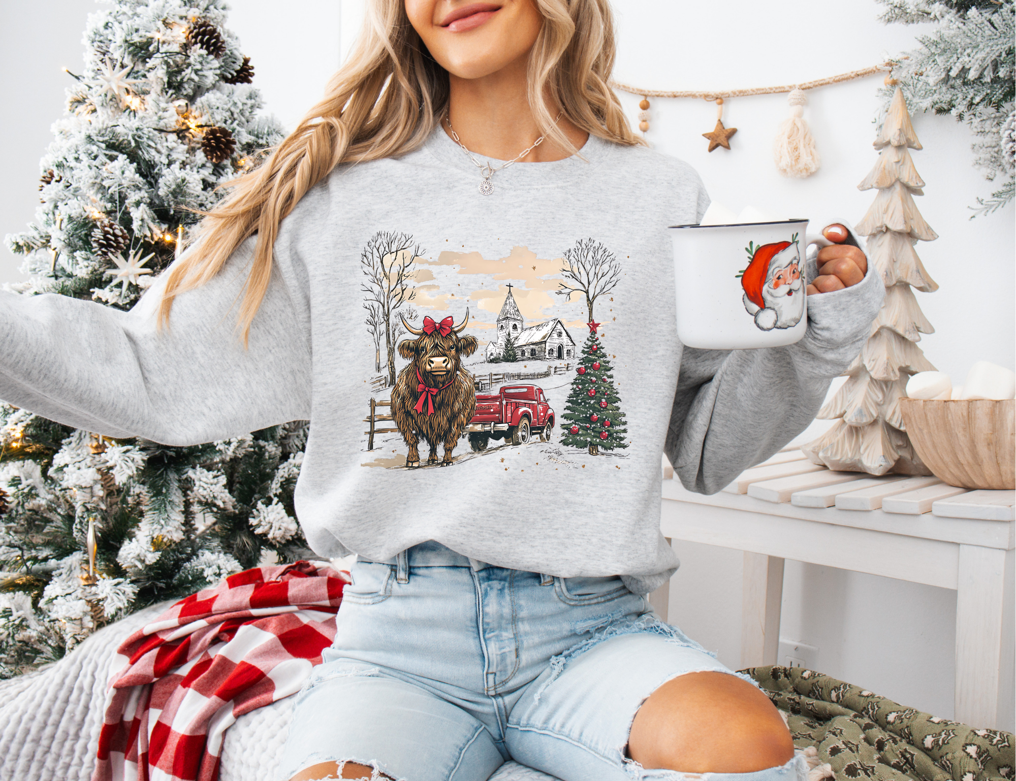 Bring rustic charm to your holiday wardrobe with this delightful farm-inspired sweater! Featuring a cheerful highland cow and vintage red truck against a cozy ash-colored knit, it's a playful nod to countryside traditions and festive spirit. Perfect for those who love all things rural and nostalgic, this classic crew neck sweater pairs beautifully with jeans for casual gatherings or holiday celebrations. Comfortable, quirky, and undeniably Instagram-worthy—your new seasonal favorite awaits.