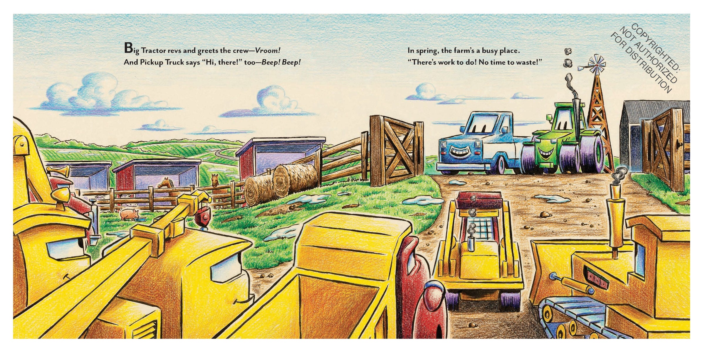 Six hardworking trucks-with help from brand-new farm vehicles-have work to do in each of the seasons: planting in spring, building a barn in the summer, harvesting in fall, and finally tucking the animals in for a cozy winter. Construction enthusiasts will love this look at a farm through the year, and all the rough, tough work there is to do!