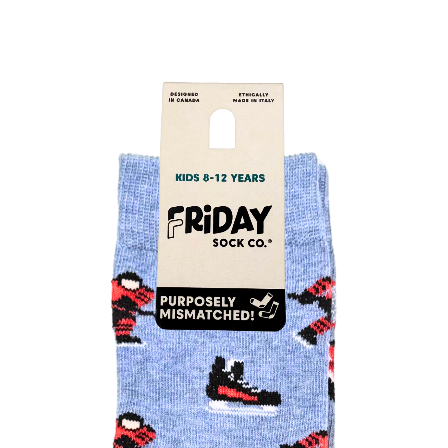 Game On! For the little hockey fan who eats, sleeps, and breathes the game! These mismatched hockey socks bring the action to their feet—because every day is a good day for a hat trick. S (ages 1-3) US shoe size toddler 5 - 9 M (ages 4-7) US shoe size toddler 10 - kids 2 L (ages 8-12) US shoe size kids 3 - 6 85% Eco-Friendly Certified Cotton, 12% Nylon, 3% Elastane No-Feel Toe Link™️ Reinforced heels and toes